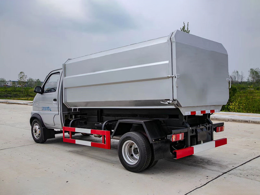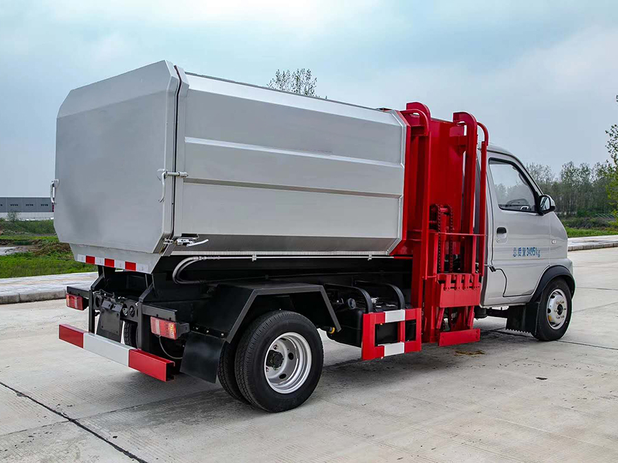 上裝配置:箱體采用邊三底三碳鋼板制作,箱體前部側(cè)面帶有掛桶提升機(jī)構(gòu),可自動(dòng)舉升垃圾桶倒入垃圾,120/240L塑料桶通用,提升機(jī)頂部自動(dòng)翻蓋,帶有手動(dòng)油門(mén),提高作業(yè)效率,箱體底部雙液壓缸舉升自卸,箱體尾部設(shè)有擋水槽防止污水外泄,尾門(mén)裝有橡膠密封條,防止二次污染。。