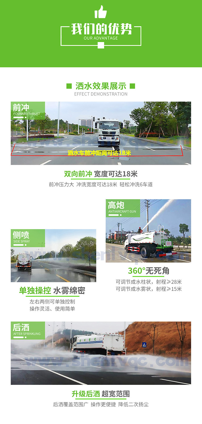 ①大鴨嘴前沖噴頭,萬向前沖球閥;②選裝氣動(dòng)球閥駕駛室內(nèi)控制;③選裝自動(dòng)灑水炮;④選裝LED箭頭燈,長條警燈;⑤選裝食品級(jí)304不銹鋼罐體;⑥選裝后加大工作平臺(tái)+霧炮機(jī)組;⑦選裝新款標(biāo)準(zhǔn)化外形。 |