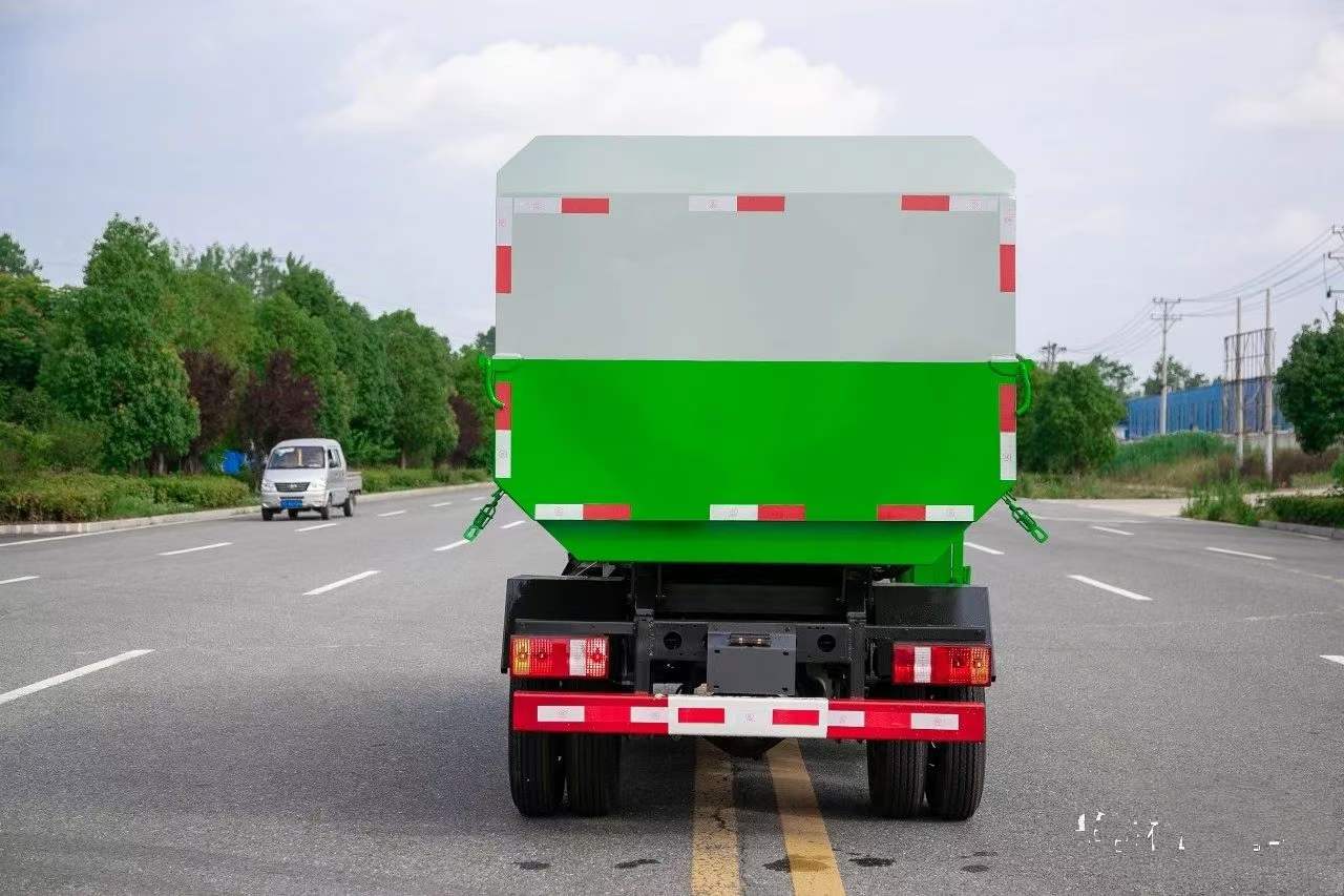 自動舉升垃圾桶倒入垃圾,提升機頂部帶機械翻蓋,箱體底部雙液壓舉升自卸,箱體后部設(shè)有擋水槽,尾部裝有橡膠密封條,防污水滴漏。