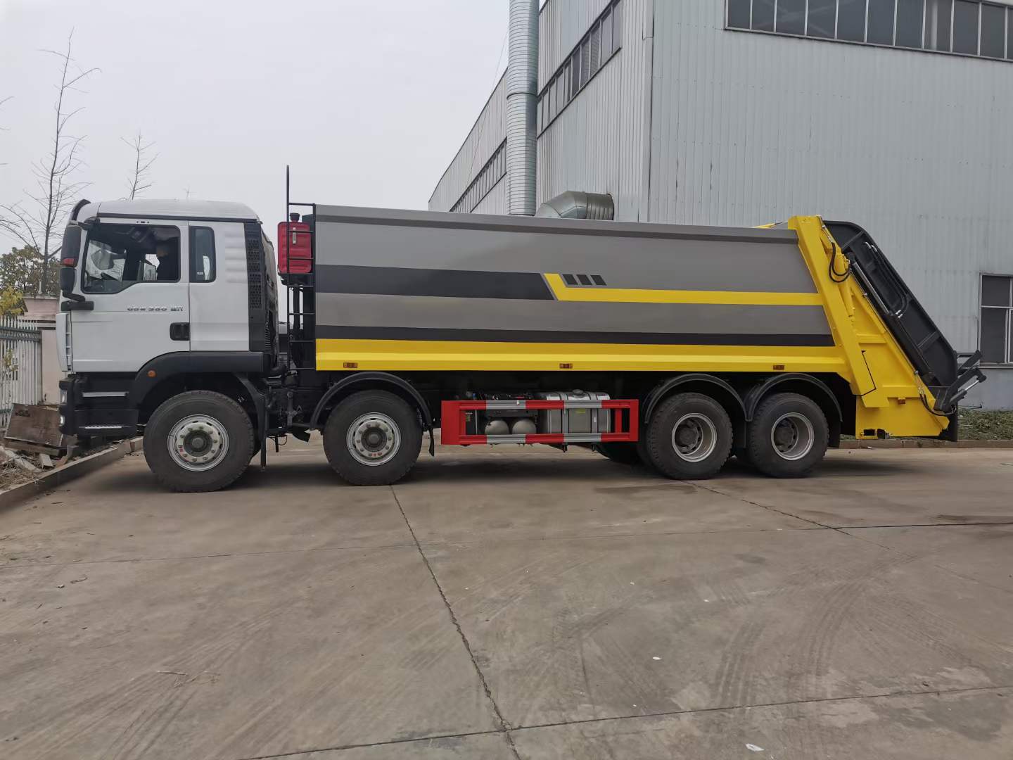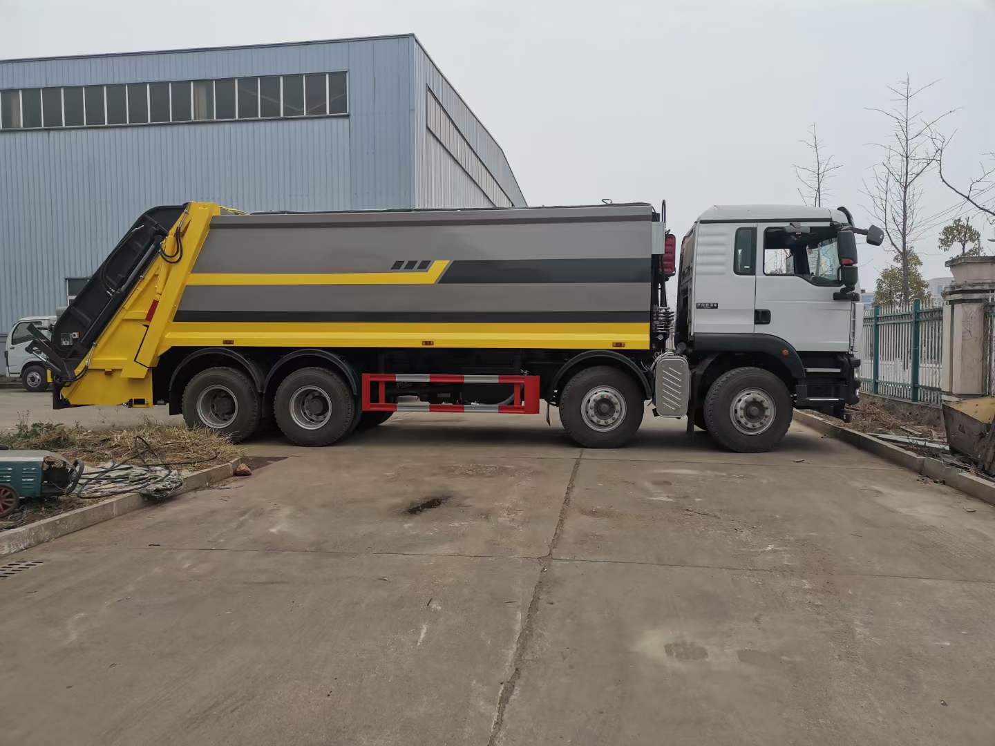 底盤配置: 配置一:濰柴350馬力,G5-M系列駕駛室,軸距:1800+3800+1350,豪沃10檔變速箱,5.5噸前橋,11噸雙后橋,280大梁,11.00R20鋼絲胎,400L油箱。自動空調(diào),四通道ABS,博世方向機,氣囊座椅,電動玻璃,中控鎖,搖控鑰匙,可調(diào)節(jié)多功能方向盤,電動調(diào)節(jié)帶加熱后視鏡。(換12檔變速箱,16噸輪邊減速橋加8000) 配置二:德國曼350馬力,G5H-W駕駛室;HW19710變速器+HW70法蘭式取力器;H653自調(diào)臂前軸(6噸鼓式);MCJ11沖焊自調(diào)臂雙后橋(曼11噸鼓式);雙層車架(8+4/280);ZF8198方向機;前后標準版多片簧(11/11/10);中位保險杠(金屬);帶ABS(4S/4M);標準版排氣系統(tǒng);無氣候包。11.00R20;速比4.63;選裝前后螺旋簧懸置;選裝300L油箱;選裝整車前下防護;選裝中國重汽智能通A版 上裝配置:1,新款弧形箱體,增加箱體容積,整車更美觀,箱體為碳鋼制作,底箱及填充器采用加厚鋼板,耐腐蝕使用壽命長,一層油漆噴涂處理。2,裝載循環(huán)時間=25S;垃圾排出時間≤25S;填料提升角度≥95°,壓縮比例為1/3-1/2,一裝部分具備雙向壓縮和蠕動壓縮功能帶。3,新款結(jié)構(gòu)加大填充器,手電一體操作模式,帶駕駛室操作,帶駕駛室一鍵卸料功能,3308軸距以上配遠距離遙控器,尾部裝置可以選裝垃圾翻轉(zhuǎn)斗,掛桶翻轉(zhuǎn)板或者大落地斗。4,CAN總線控制方式,光電開關加延時雙系統(tǒng)控制,降低故障率,方便維修。5,帶夜間照明裝置,6方)及以上車型帶雙污水箱,污水箱排水球閥和排水蓋,增加排水管,防止濺水,人性化設計。6,標配選用:威森搏樂油缸,威森搏樂多路閥,3308軸距以上配備壓實閥(背壓閥),所有車型標配單泵。5000軸距、后八輪車型標標配雙聯(lián)泵,大油量多路閥。 選裝配置:大落地斗,帶后擺臂,另帶單一掛桶裝置,尾部密封蓋手動/氣缸控制,雙聯(lián)泵(多路閥聯(lián)數(shù)增加,液壓泵加大,液壓油箱加大) |